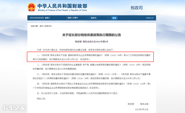 重型货车智能视频监控报警装置的招标采购工作已经在2月23日完成,据悉相关安装工作已经在3月1日起实施。●  挂车购置税减半征收 政策延长至2023年12月31日2021年3月15日,财政部、税务总局发布《关于延长部分税收优惠政策执行期限的公告》(财政部 税务总局公告2021年第6号),明确表示:半挂车购置税减半政策延长至2023年12月31日!
