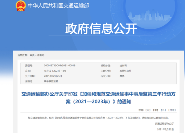 其中,在“公路管理领域事中事后监管三年行动工作任务”当中:1、强化货车违法超限超载监管2、强化大件运输许可监管(详情链接:交通部发文:加强交通运输事中事后监管
