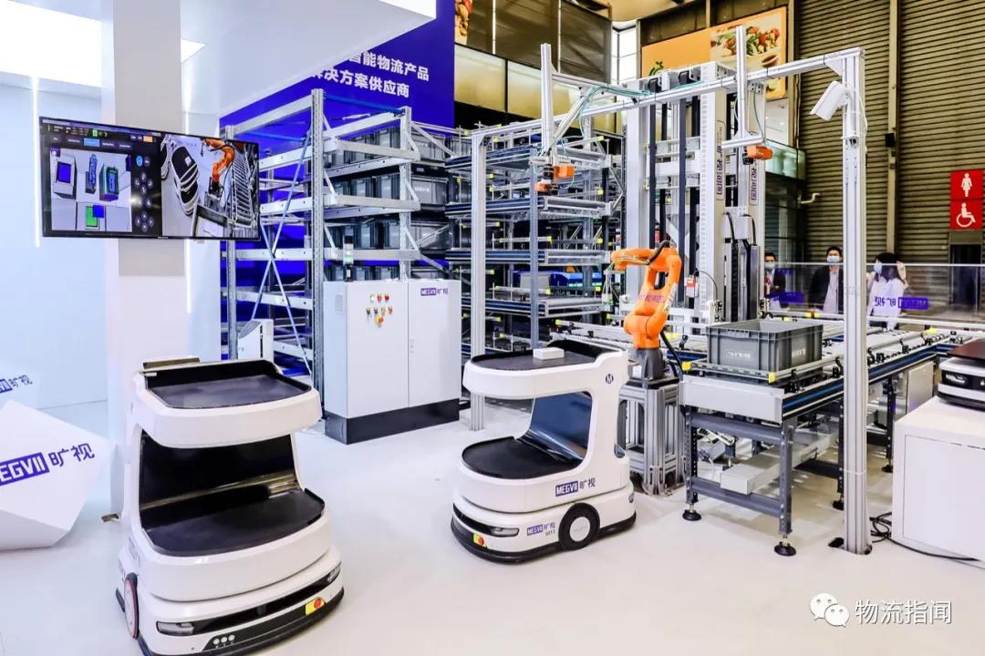 图:旷视CeMAT 2020展示河图调度的箱式四向穿梭车密集存储+货到机器人拣选+机器人搬运解决方案